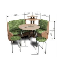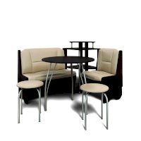 Оригинальный кухонный уголок Лотос отличается от других похожих кухонных гарнитуров. Он состоит из двух отдельных диванчиков и этажерки, заменяющей угловую мягкую часть. Круглый кухонный стол в отличие от других наборов мебели на металлическом основании как и два круглых табурета. Набор мебели для кухни включающий в себя большую прямую скамью,малую прямую скамью,угловую этажерку, стол на металлических ногах и два табурета на металлокаркасе. В прямых скамьях под сиденьями расположены ящики.