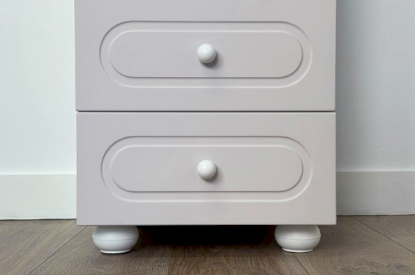 Корпус выполнен из ЛДСП толщиной 16 мм, фасад изготовлен из МДФ в плёнке ПВХ и декорирован фрезеровкой, подчёркивающей стиль серии Милана. Оригинальные круглые ручки и опоры дополняют дизайн, придавая шкафу аккуратный и современный внешний вид.